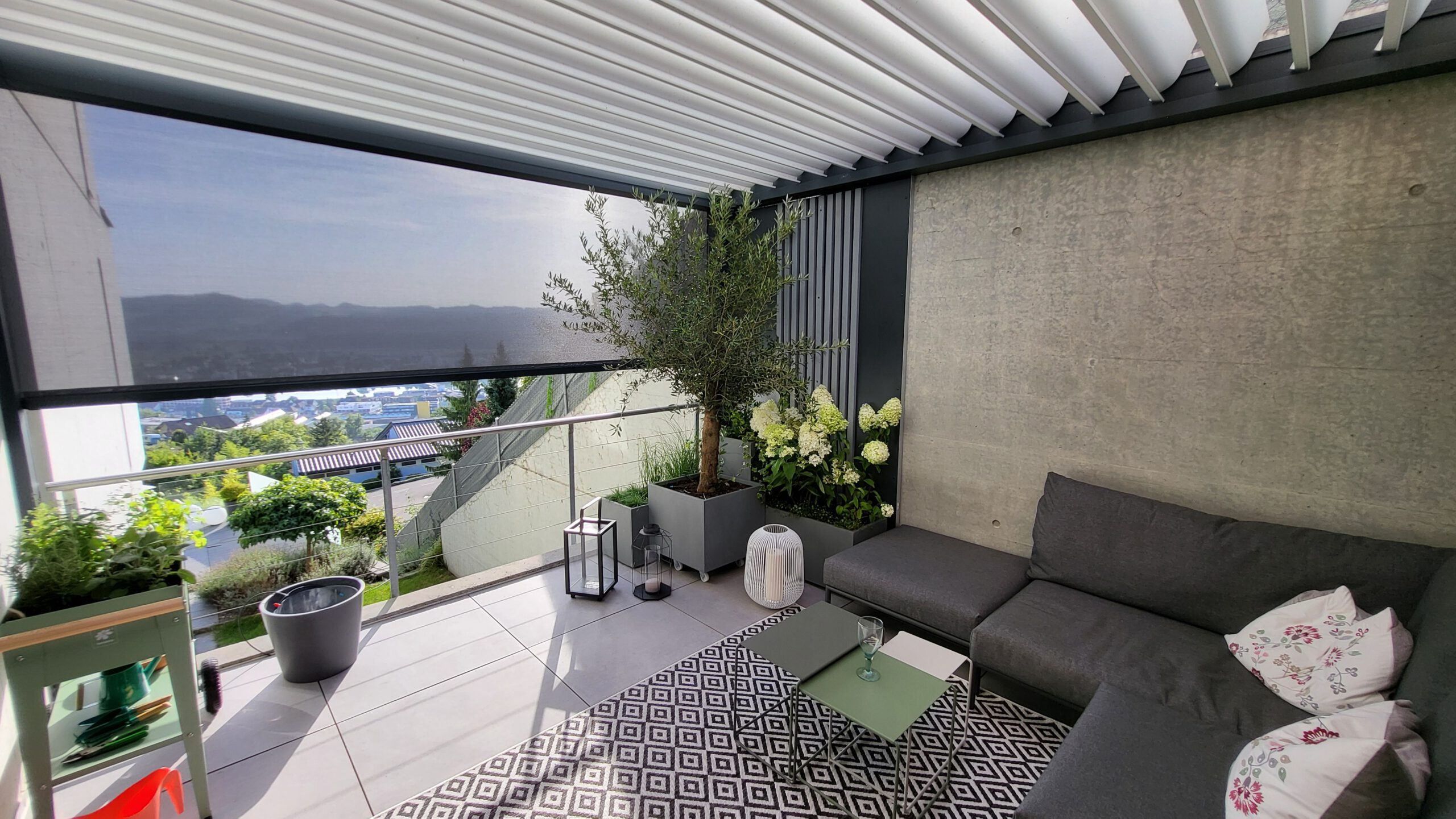Das Rahmengestell in Anthrazitgrau (RAL 7016) bildet einen stilvollen Kontrast und fügt sich harmonisch in die bestehende Architektur ein. Ein integrierter Screen schützt nicht nur zuverlässig vor Sonne, Wind und Wetter, sondern auch vor neugierigen Blicken vom angrenzenden Durchgangsweg. So entsteht ein geschützter, vielseitiger Außenbereich – perfekt für gesellige Abende oder entspannte Stunden mit der Familie.