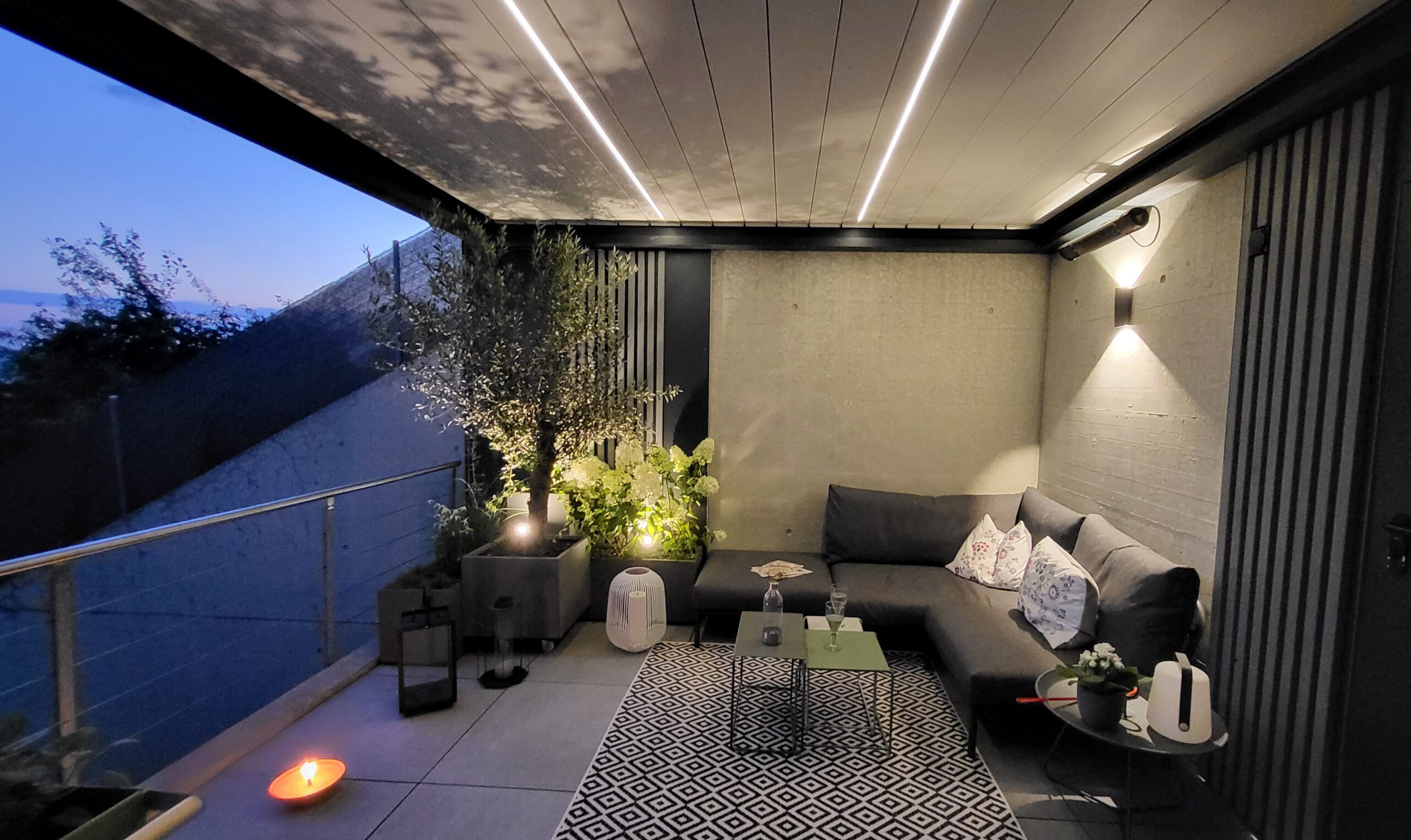 - In den Lamellen sind LEDs integriert, die für eine stimmungsvolle Beleuchtung am Abend sorgen und die Nutzung der Terrasse bis in die Nacht hinein ermöglichen.