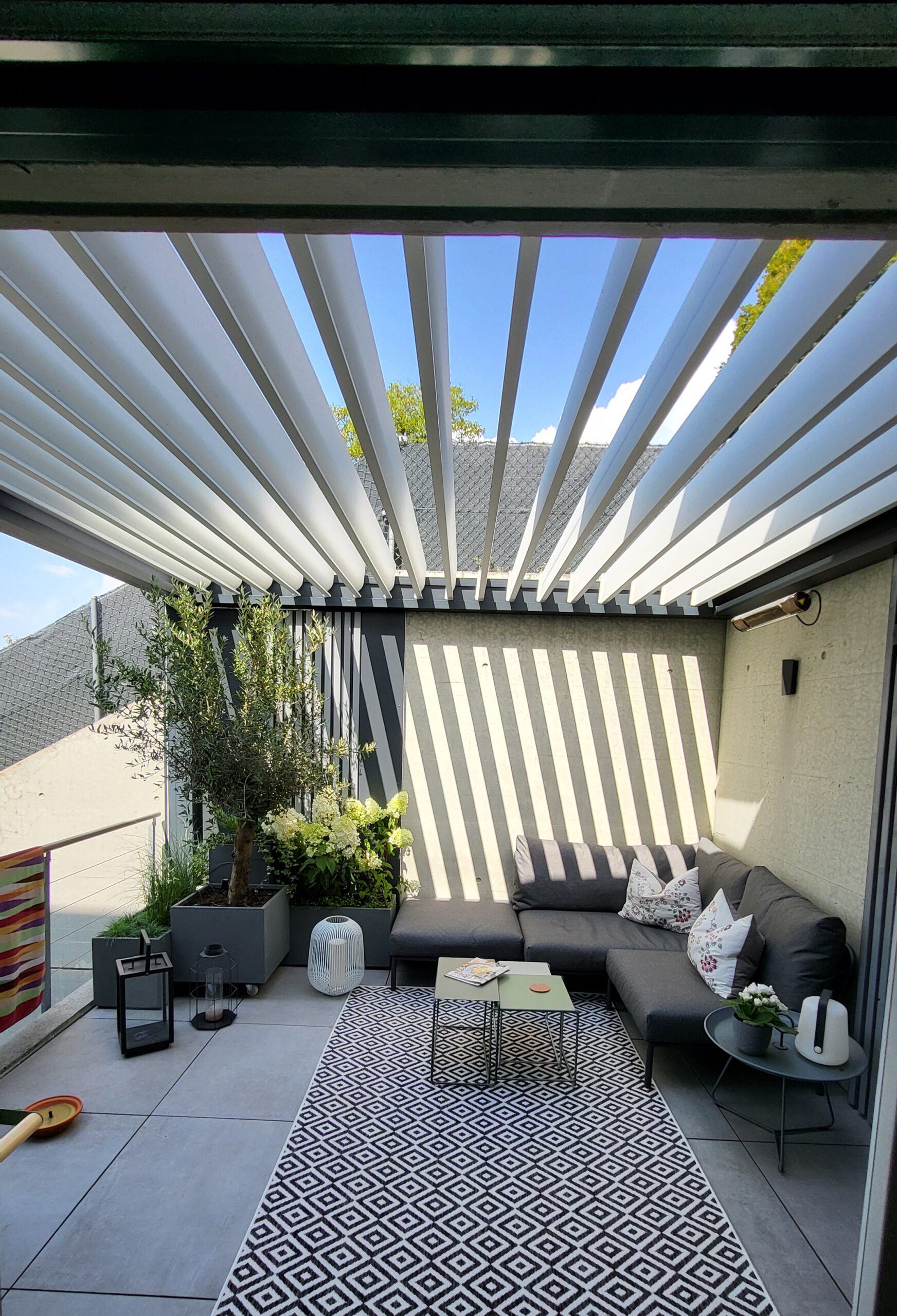 Bei diesem Projekt wurde die B160XL als funktionale und zugleich elegante Lösung direkt ans Haus angebaut. Um möglichst viel Tageslicht ins Innere zu lenken, fiel die Wahl auf weiße Lamellen. Das Rahmengestell wurde farblich exakt auf die bestehenden Fenster in RAL 7016ST abgestimmt. Zwei Seiten der Anlage waren bereits durch die Hausarchitektur geschlossen, die beiden offenen Seiten wurden mit Unterbau-Screens in Charcoal Grey ergänzt. So entstand ein rundum geschützter, nutzbarer Außenraum – winddicht, sichtgeschützt und sogar insektenfrei.