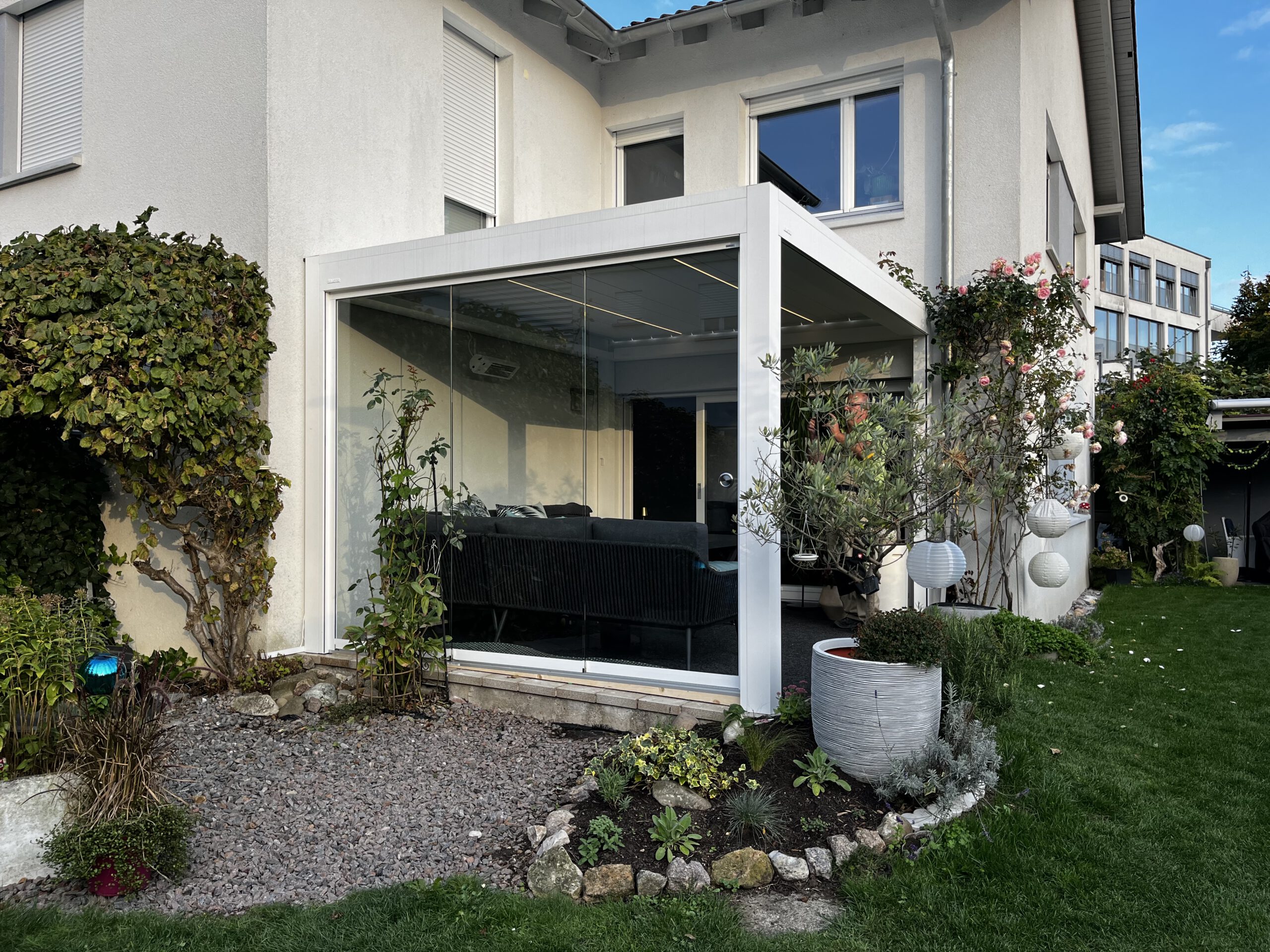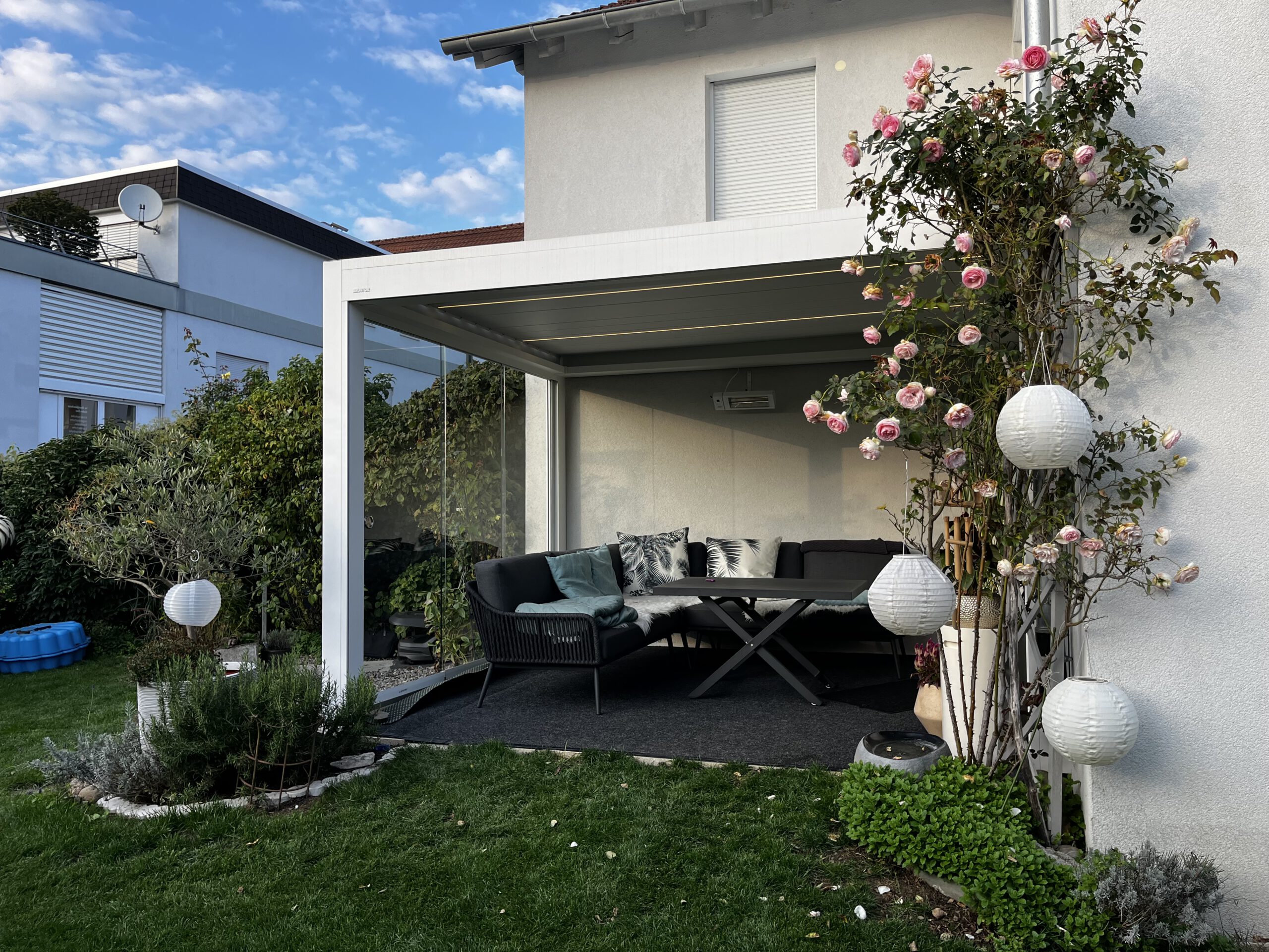 Die Anlage ist wasserdicht und durch den direkten Anbau ans Haus ideal geeignet, um die Terrasse bei jedem Wetter als Wohnraumerweiterung zu nutzen